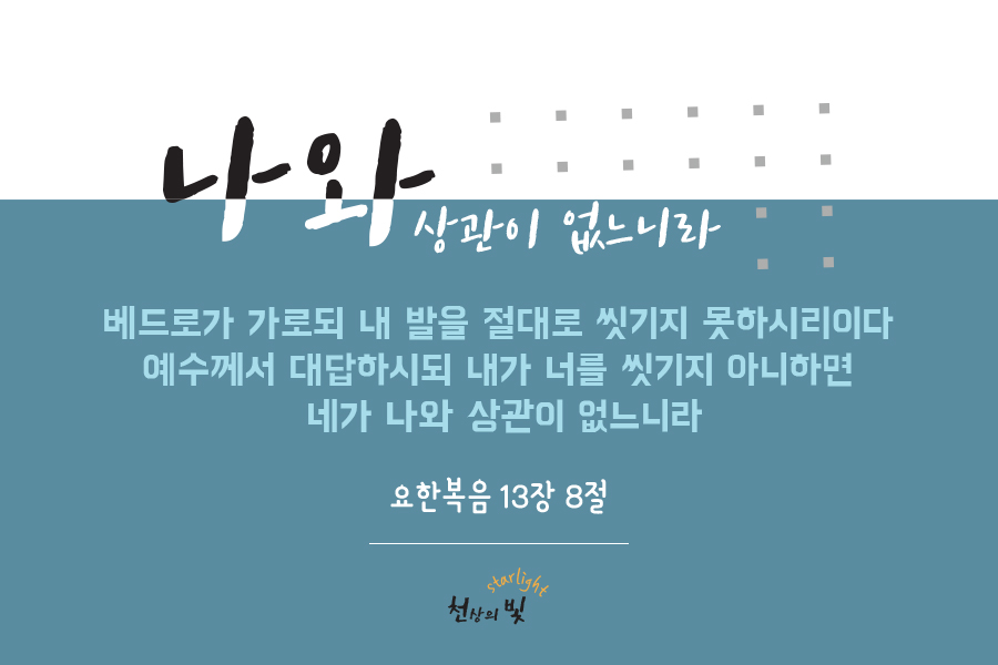 예수께서 제자들의 발을 씻기지 않으면 나와 상관이 없는 관계가 된다고 설명하여 주셨습니다. 구원자이신 예수님과 아무 관계가 성립되지 않는다는 것 만큼 두려운 말씀은 없죠.