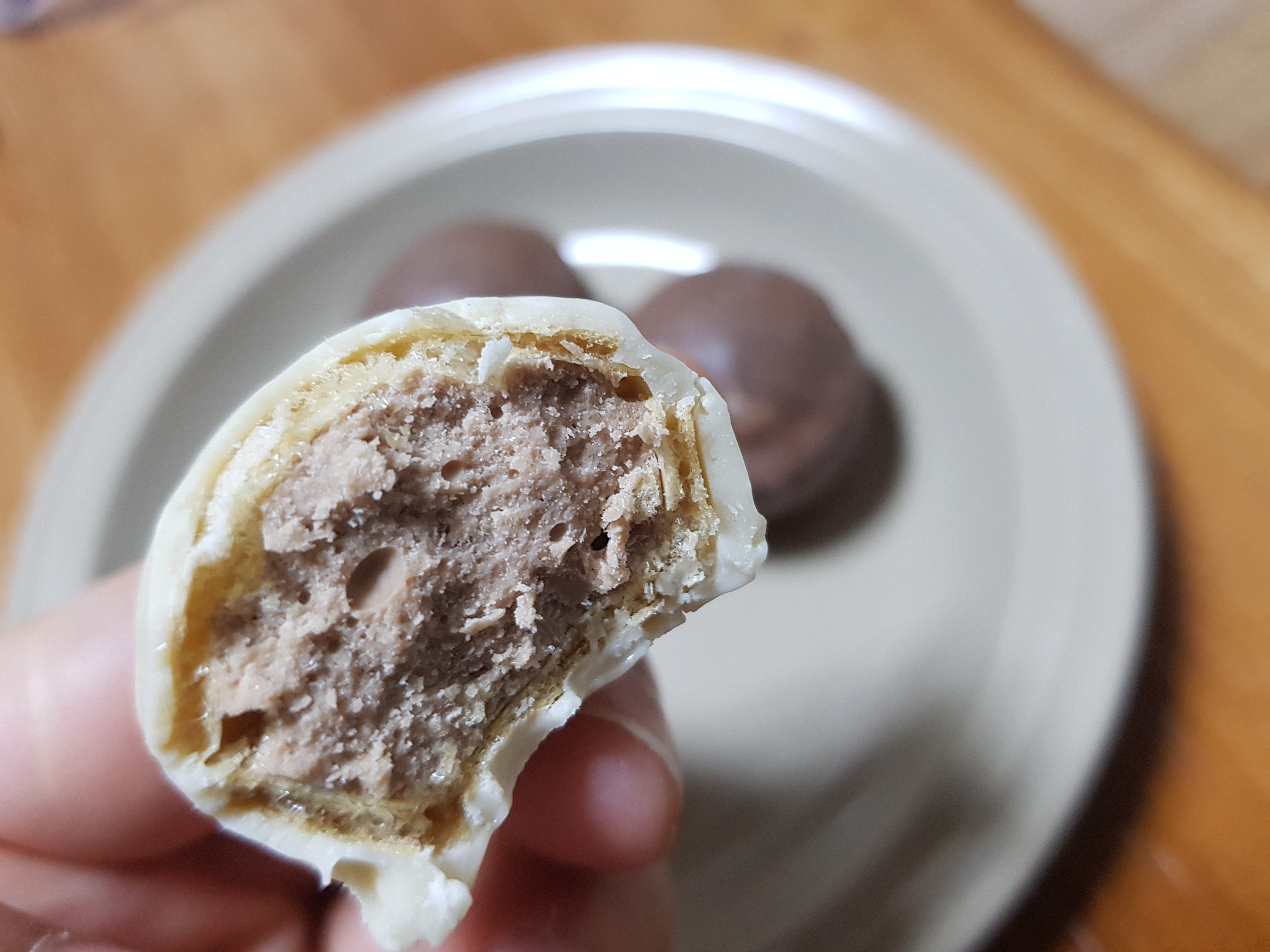 겉은 초코 웨하스 느낌이고, 속에 달콤한 초콜릿이 들어 있어요.
